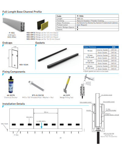 Das MN50-Profil mit seiner eloxierten Aluminiumoberfläche ist die perfekte Lösung für die Installation von rahmenlosen Glasgeländern sowohl im Innen- als auch im Außenbereich. Sein schlichtes, lineares Design verleiht jeder Art von Balustrade und Balkon einen Hauch von Eleganz und Modernität, während gleichzeitig ein atemberaubender Ausblick erhalten bleibt. Das Aluminium-Basisprofil wurde entwickelt, um Glas in verschiedenen Stärken aufzunehmen. Es ist vielseitig einsetzbar und passt sich Glaspaneelen von 5+5 mm bis 10+10 mm an. Die Montage ist einfach: Ein Ankerbolzen wird am Boden befestigt, dann wird das Glaspaneel in das Profil eingeschoben, wodurch eine schnelle und sichere Montage gewährleistet wird.