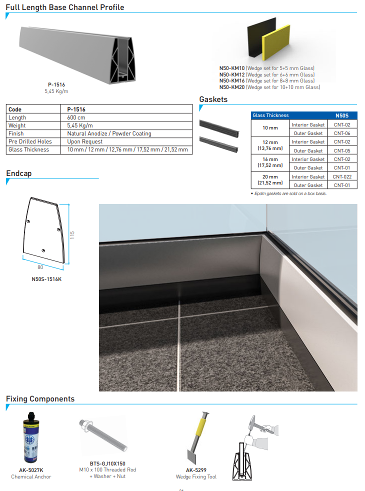 Disponible en longueurs de 6 mètres, il peut être pré-percé selon les spécifications du client. Ce système est adaptable avec des verres d'une épaisseur variant de 12 mm à 21,52 mm.