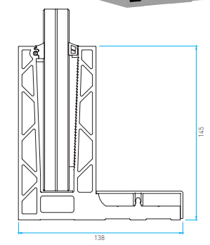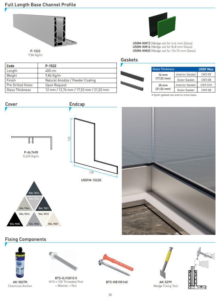 La profondeur d'insertion dans le profilé est de 103 mm pour un verre de 12 mm d'épaisseur, et de 105 mm pour des verres d'une épaisseur comprise entre 15 et 21 mm. C