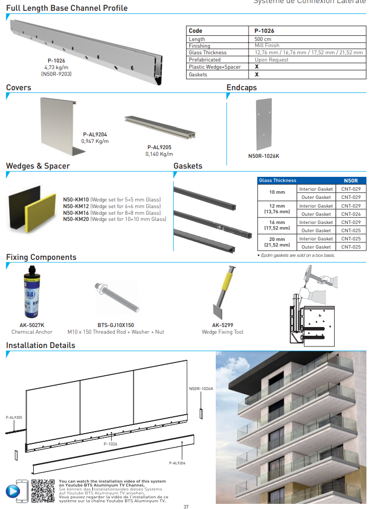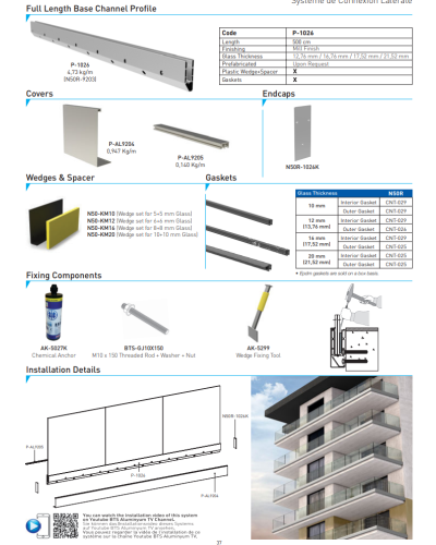 Il est accompagné d'un ensemble de montage innovant, comprenant des cales pour le verre déjà assemblées et des joints en caoutchouc de haute qualité, assurant une installation aisée avec un profilé de recouvrement.