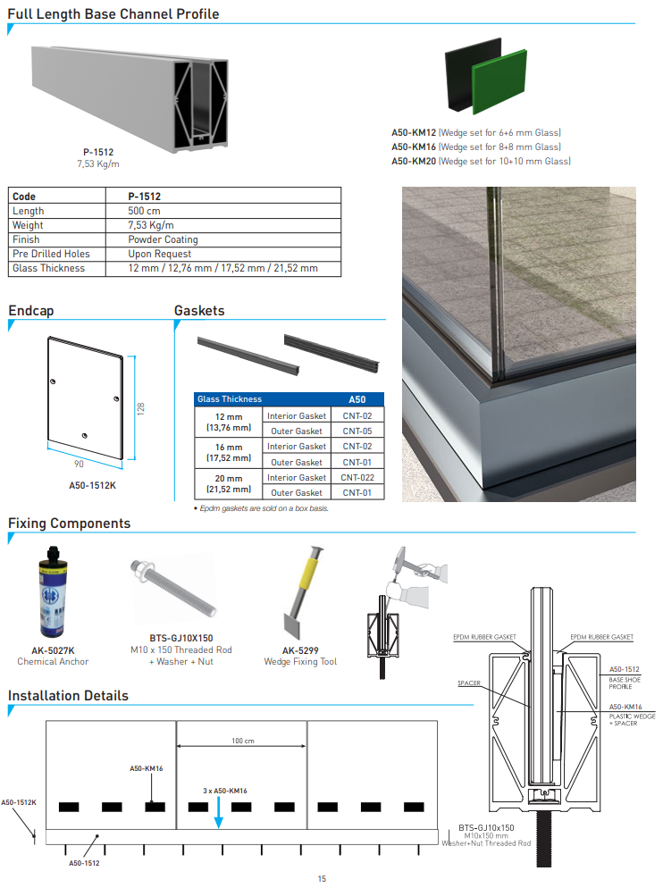MA50 est composé de profilé de garde-corps en verre imposant d’une largeur totale de 90 mm et une hauteur de 128mm qui convient aux zones à fort trafic. La profondeur de maintien de verre de 107mm donne une force supplémentaire sur les charges élevées. Il est compatible avec du verre de sécurité de 12 mm, 17,52 mm, et 21,52 mm épaisseur.